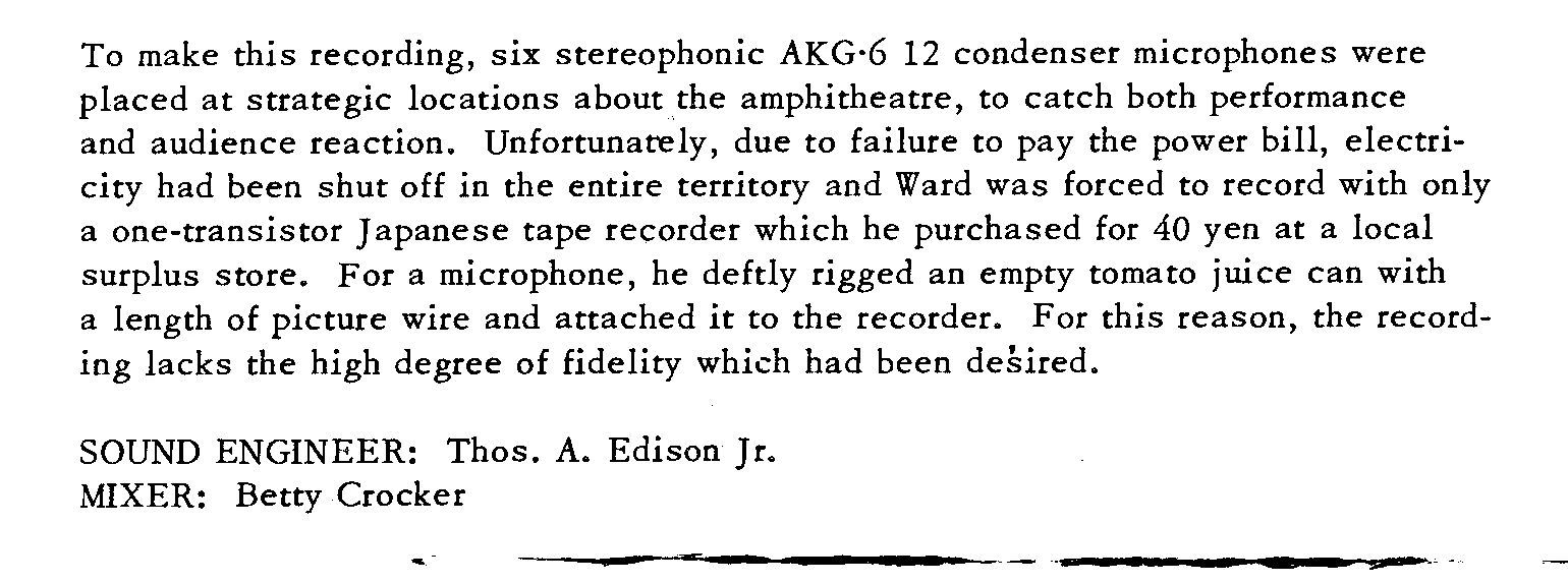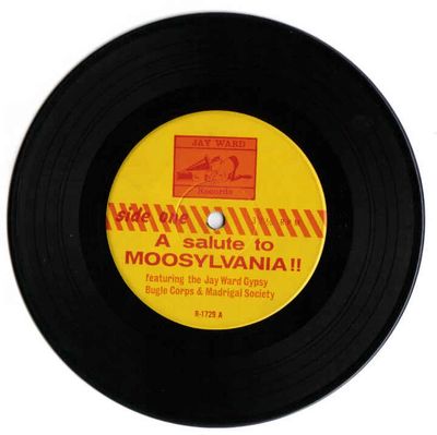 The time: 12:45 AM - - the date: June 14, 1962 - - the temperature: 12 degrees above zero - - the place: The 1st Annual Moosylvania Jazz Festival. Wee Bonnie Baker had just left the stand after a three-hour stint that had left the audience of 18 hardy jazz buffs limp, bur still screaming for more. Backstage, impresario Jay Ward, promoter of the event, had just received a phone call from Albert White and the Morris Plan Masters of Melody, who were to appear next on the program in a musical pageant saluting the announcement of Moosylvania's application for state-hood. Entitled "A Musical Pageant Saluting the Announcement of Moosylvania's Application For Statehood'', this was to be the highlight of the entire festival. It seems that their chartered bus had encountered a midsummer blizzard about seven mites from the Bullwinkle Bowl, where the festival was being held, and they were trapped in an eight foot snowdrift. Undismayed by this unlucky turn of events , the nimble-minded Ward quickly recruited a ''pick-up" band and glee club from the audience, including three comb-and-tissue paper players, a musical bottle virtuoso, and a Samoan conch-shell blower. With only five minutes rehearsal backstage, the makeshift ensemble took their places before the skeptical audience. Before the closing notes of their first number were completed, cheers and shouts of "go man, go!'' and ''Lynch 'em!" rocked the famous old amphitheatre. A new jazz legend was born! Choked with emotion, Ward was moved to make a feeling-packed 6 hour speech, none of which, luckily, is contained herein. I feel that the electricity and excitement of this magic night is captured magnificently on this recording, which, due to lack of sales, is destined to become a collector's item.