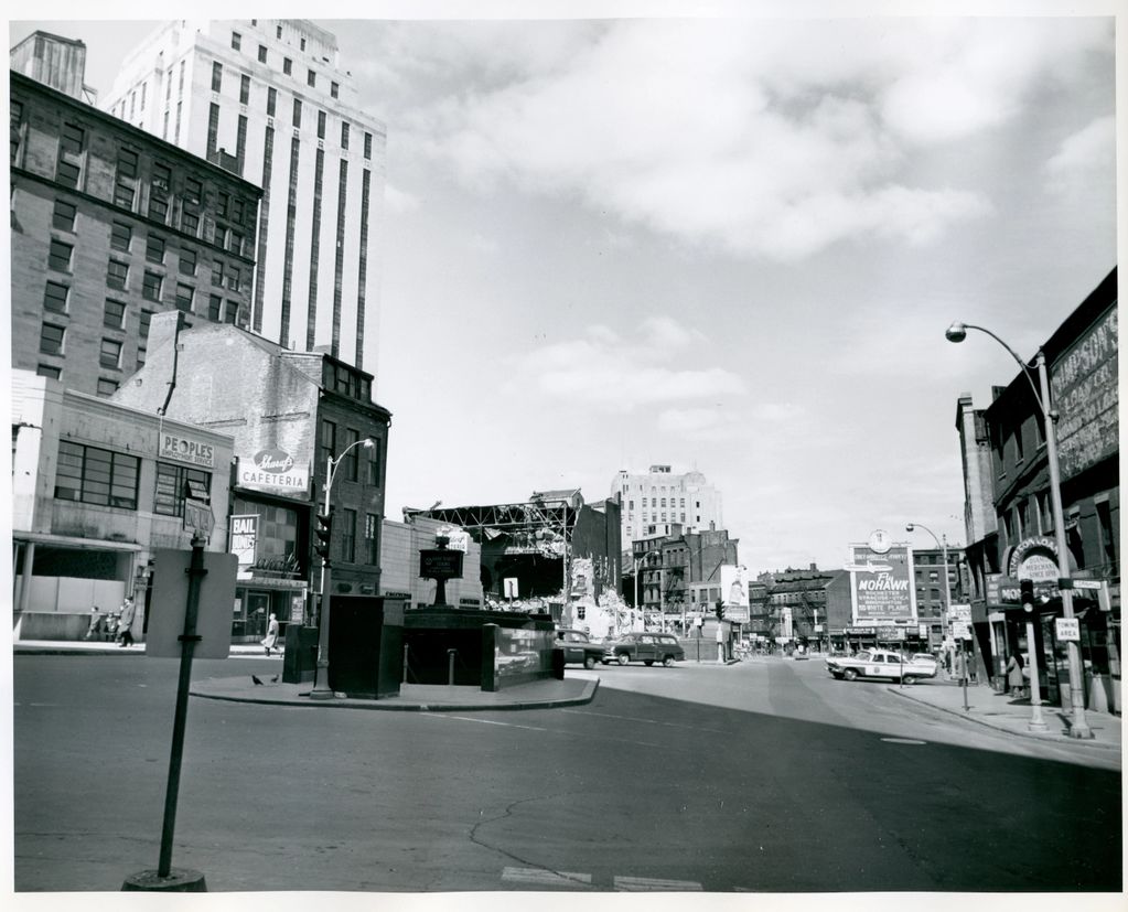 Despite the massive amounts of construction during the era of renewal, life went on In this 1962 photo the famous Tea Kettle (which would survive the redevelopment) watches mutely as commuters make their way to work through the Square. Meanwhile, across the street Scollay's Olympia was not as lucky.