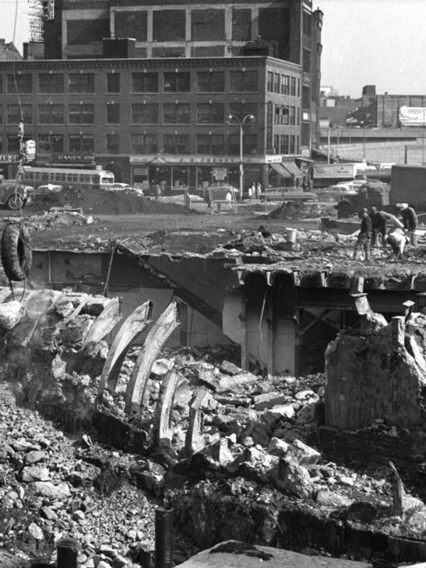 Demolition of the old Scollay Square subway station has begun in 1962. In the foreground we can workers tearing up a portion of the tunnel (notice the tiles on the underground wall) between Scollay and Adams Square. Meanwhile, in the background, Cheney's Drug Store carries on...