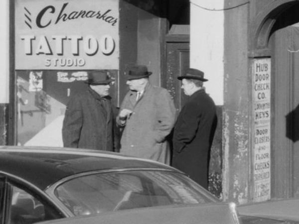 Before we move on, who can resist this closer look at the three men in front of the tattoo parlor. Here they are, and aren't they great? Can't you just hear one of the them singing "I got the horse right here, his name is Paul Revere..." Don't they visually sum up the impression most people had of Scollay Square in the 1950s - old, maybe quaint, but, with all due respect, just a bit seedy? (Library of Congress)