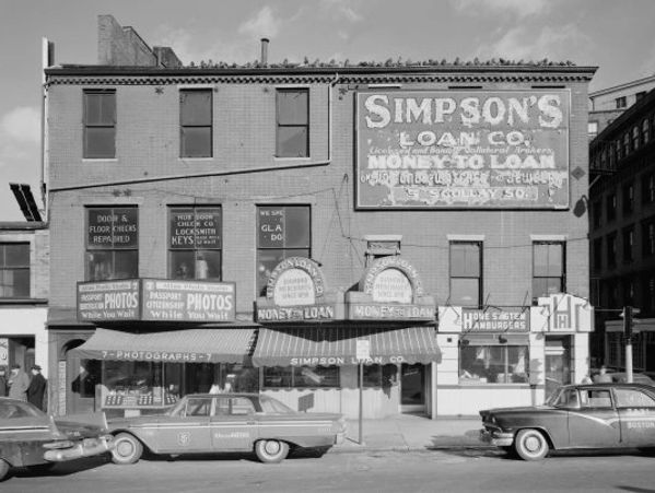 Across Cornhill from the Court Street Tavern, the chipped and peeling sign for the venerable Simpson's Loan company is another clue to the effects of a depressed Boston economy that, during the 1950s, prompted city officials to consider drastic measures to revitalize this part of Boston's downtown. (Library of Congress)