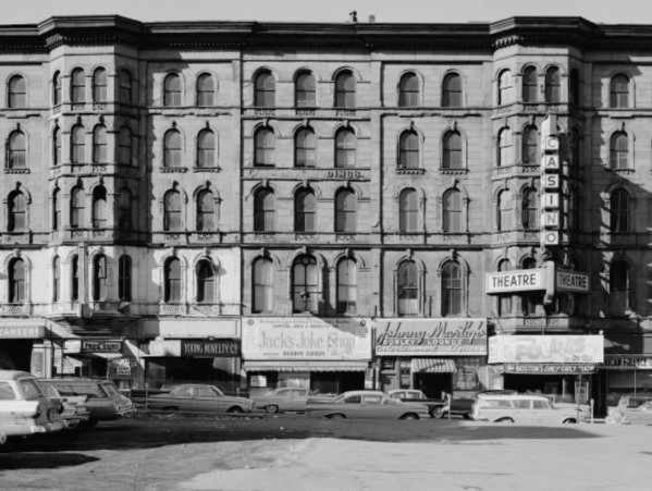 It is 1962 on Hanover Street as Jack's Joke Shop, the Casino Theatre, and other businesses hang on for dear life as the wrecking ball makes its way through Scollay Square. (B.R.A.)