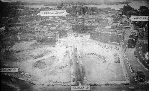Taken about a year after the above aerial, we can see rebar being placed for construction of the new (now replaced) Government Center T station with its distinctive slant. We also see construction of the subway line which will run to Haymarket, under City Hall Plaza. In the background we see pre-renewal Dock Square and Faneuil Hall, while further back is Quincy Market.